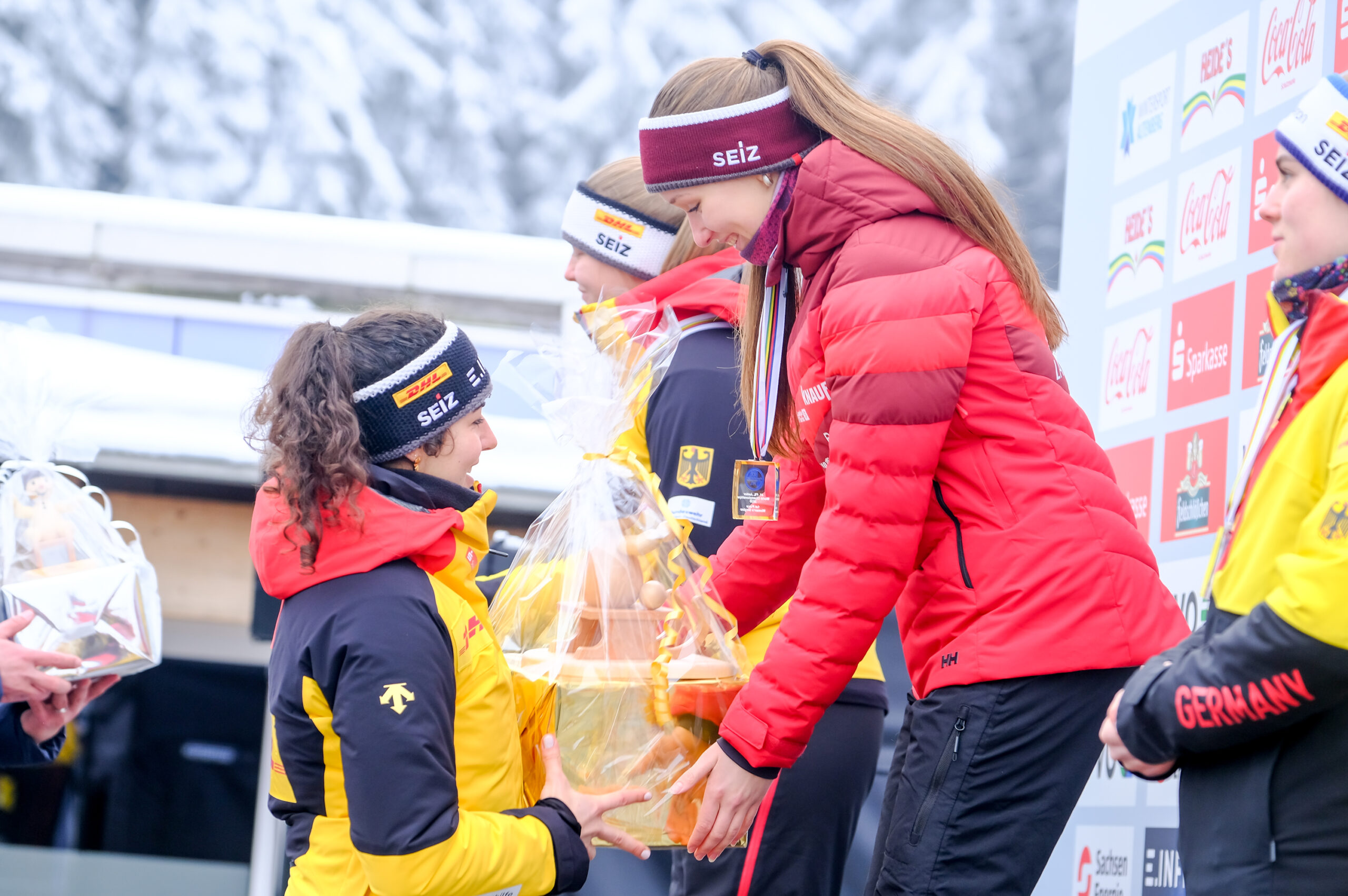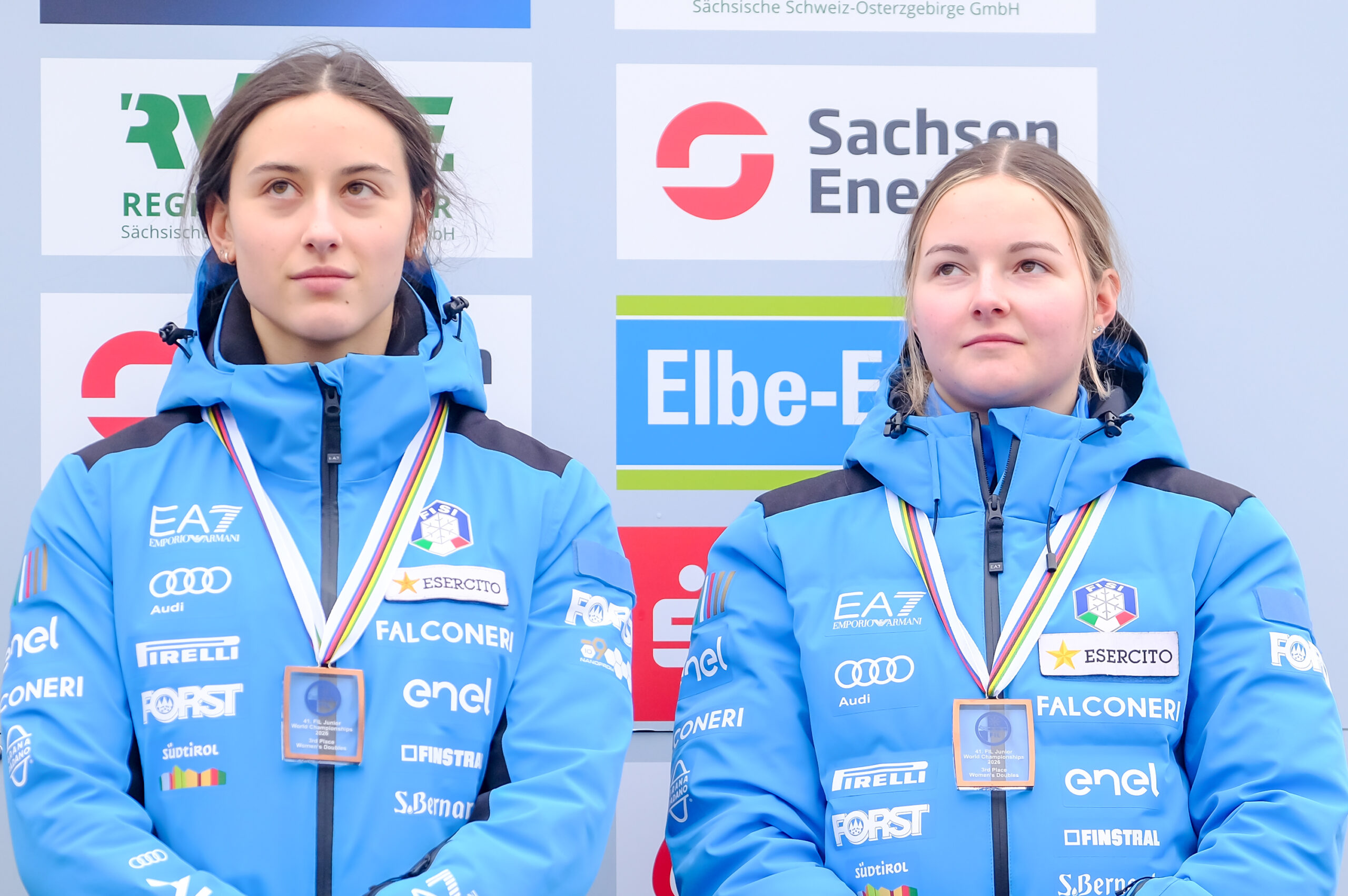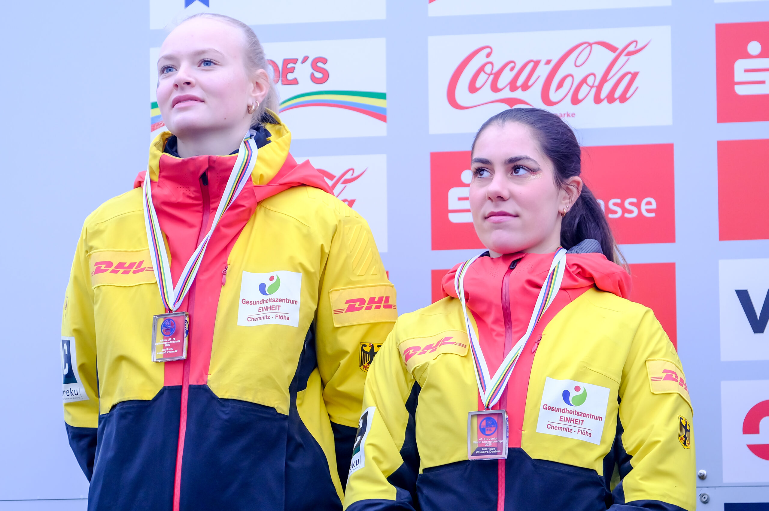 Große Freude herrschte nach dem Rennen der Doppelsitzerinnen auch bei den neuen Vize-Juniorenweltmeisterinnen Luise Röder und Maria Schneider (beide ESV Lok Chemnitz). Mit gerade einmal 15 bzw. 16 Jahren waren die Sächsinnen die jüngsten Starterinnen im Feld und nach dem Rennen überglücklich, bei ihrem JWM-Debüt auf ihrer Heimbahn gleich die Silbermedaille einzufahren. Über JWM-Bronze freuten sich die Italienerinnen Alexandra Oberstolz und Katharina Sofie Kofler, die nach zwei Läufen etwas mehr als eine halbe Sekunde Rückstand auf die Siegerinnen hatten.