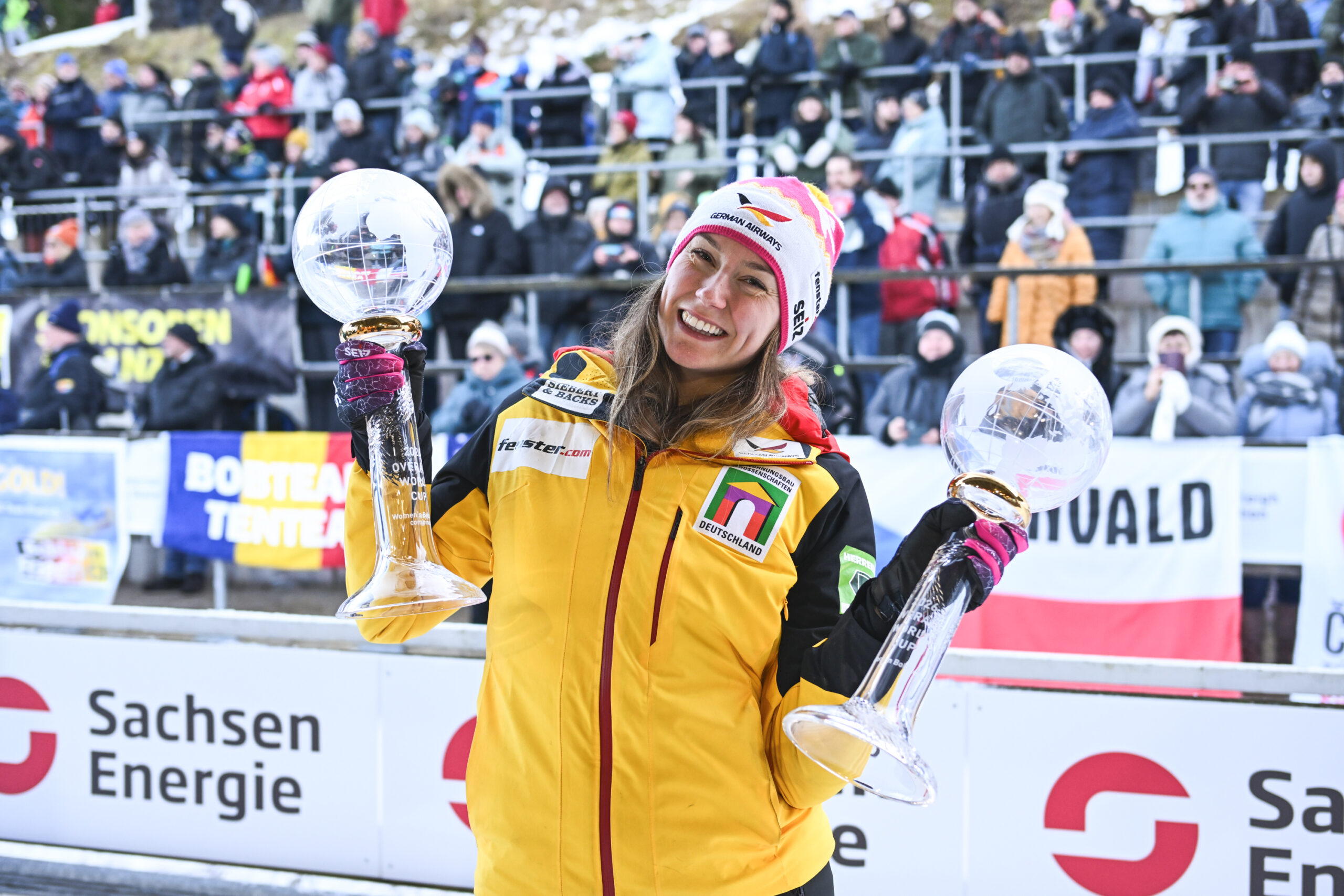 Laura Nolte: „Wir sind mega-happy, das waren zwei perfekte Läufe und zwei super Startzeiten. Im ersten Lauf hatten wir schon Startbestzeit, da war aber viel Wind und wir wussten, wir können noch mehr. Aber dass es gleich eine 50 wird, damit hätte ich auch nicht gerechnet. So können wir mega-happy nach Hause fahren. Das war eine perfekte Saison bisher, ich bekomme in allen drei Disziplinen die Kugel. Da geht auch ein Riesendank an alle Anschieberinnen raus, vor allem an meine Mädels, aber auch an alle. Vor allem die Monobob-Tage sind für sie extrem anstrengend und die könnte ich alleine gar nicht schaffen. Daher bin ich da immer auf Unterstützung angewiesen, und dafür bin ich einfach sehr dankbar.“